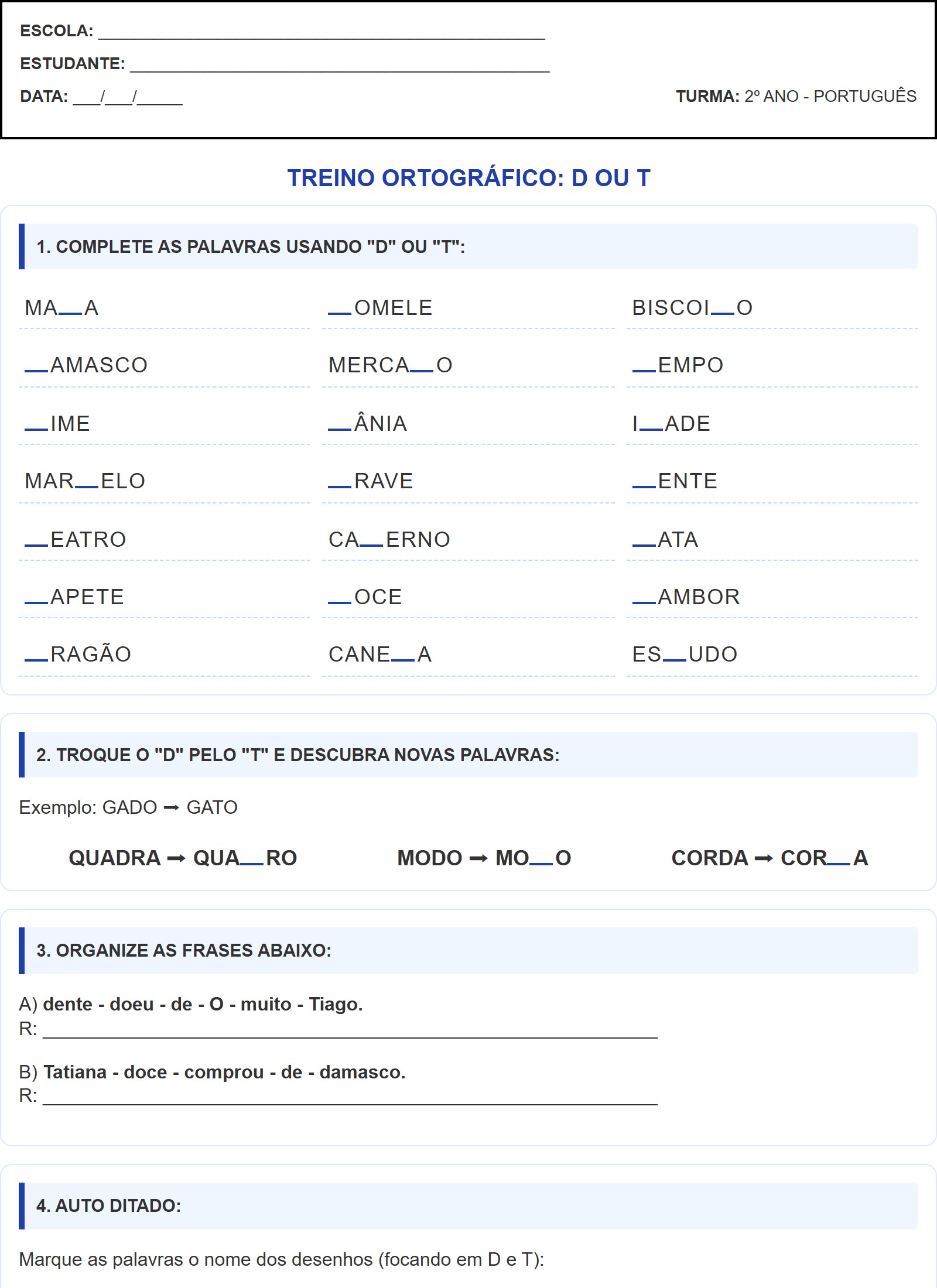 Marque as palavras o nome dos desenhos (focando em D e T):