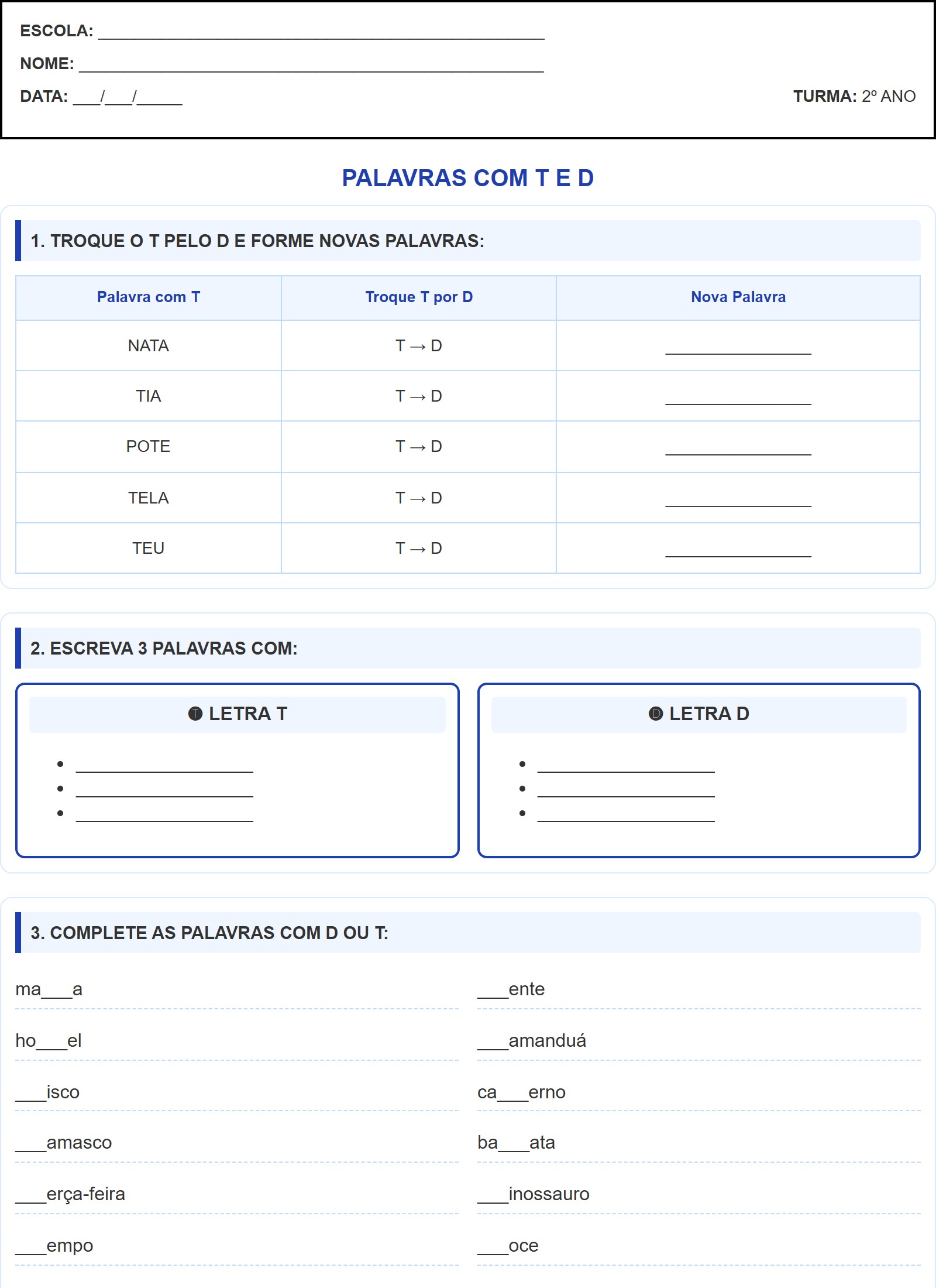 | Palavra com T | Troque T por D | Nova Palavra |