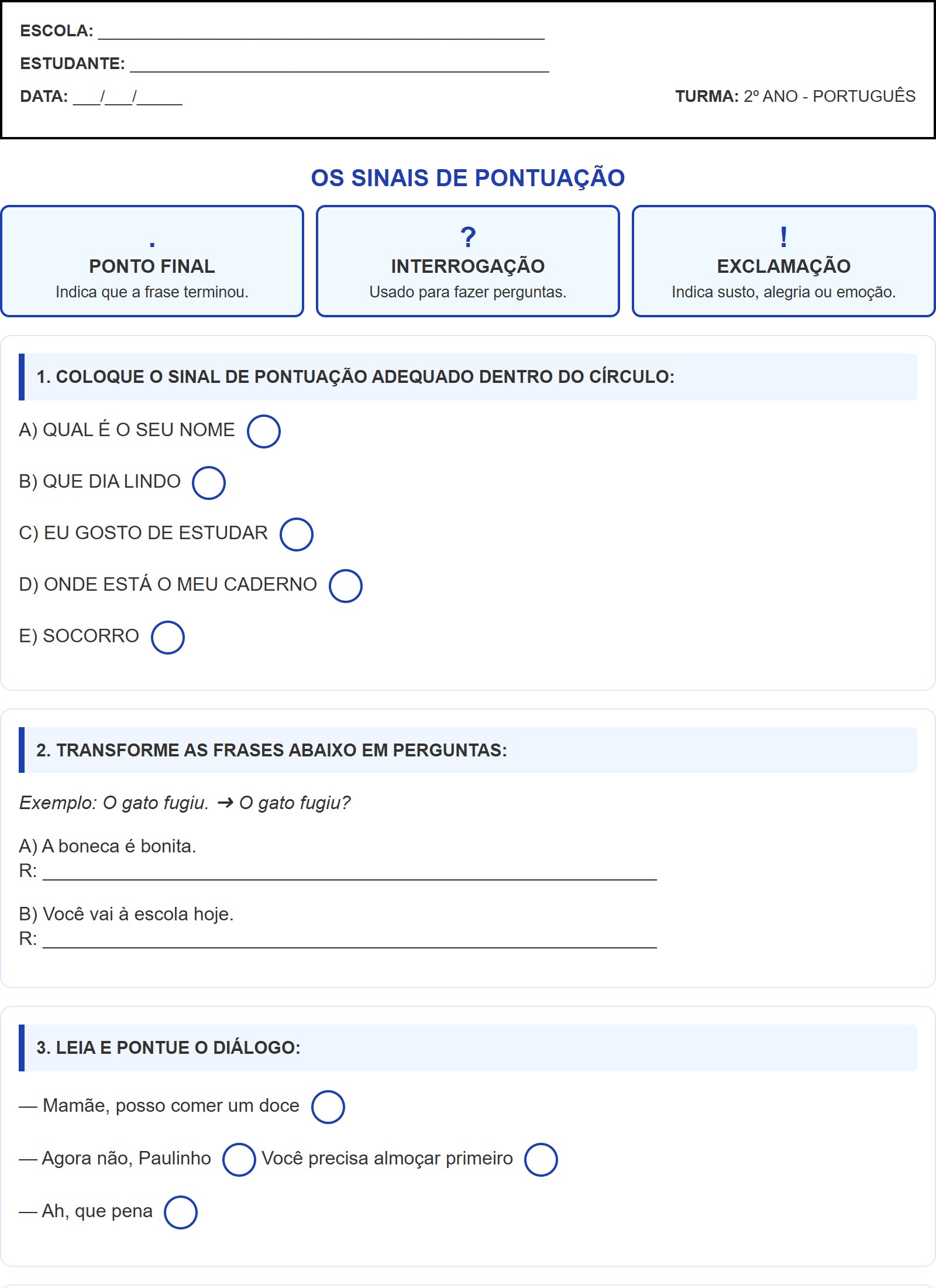 1. COLOQUE O SINAL DE PONTUAÇÃO ADEQUADO DENTRO DO CÍRCULO: