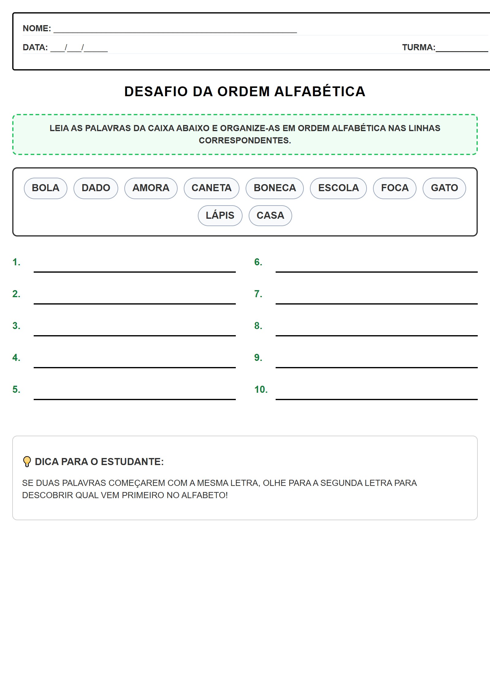 Esta atividade de ordem alfabética para o 2º ano desafia o aluno a organizar palavras com diferentes níveis de dificuldade. No segundo ano do Ensino Fundamental, é importante que a criança comece a observar não apenas a primeira letra, mas também a segunda letra da palavra para determinar sua posição no dicionário.