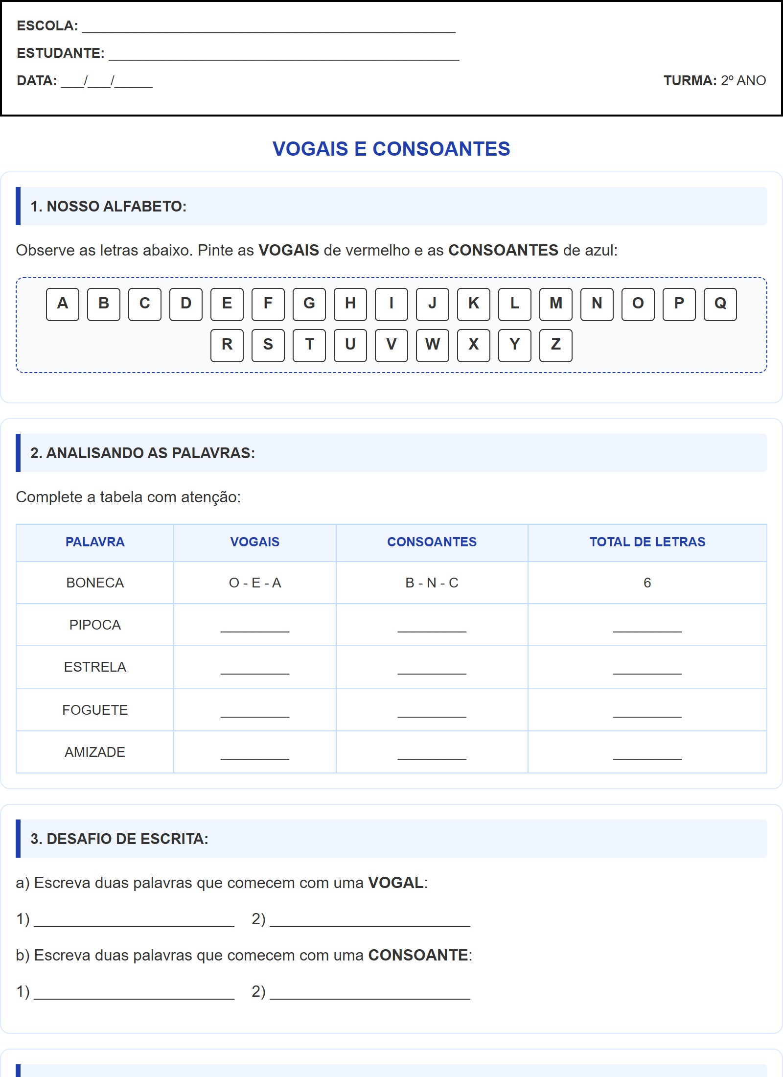 Observe as letras abaixo. Pinte as VOGAIS de vermelho e as CONSOANTES de azul: