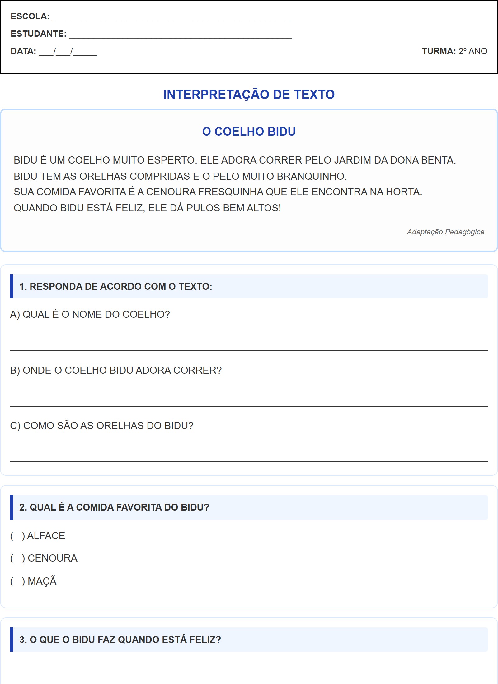 Atividade de Interpretação de Texto 2º Ano Atividade de Interpretação de Texto 2º Ano Fundamental Atividades de Reforço de Português: Leitura e Escrita