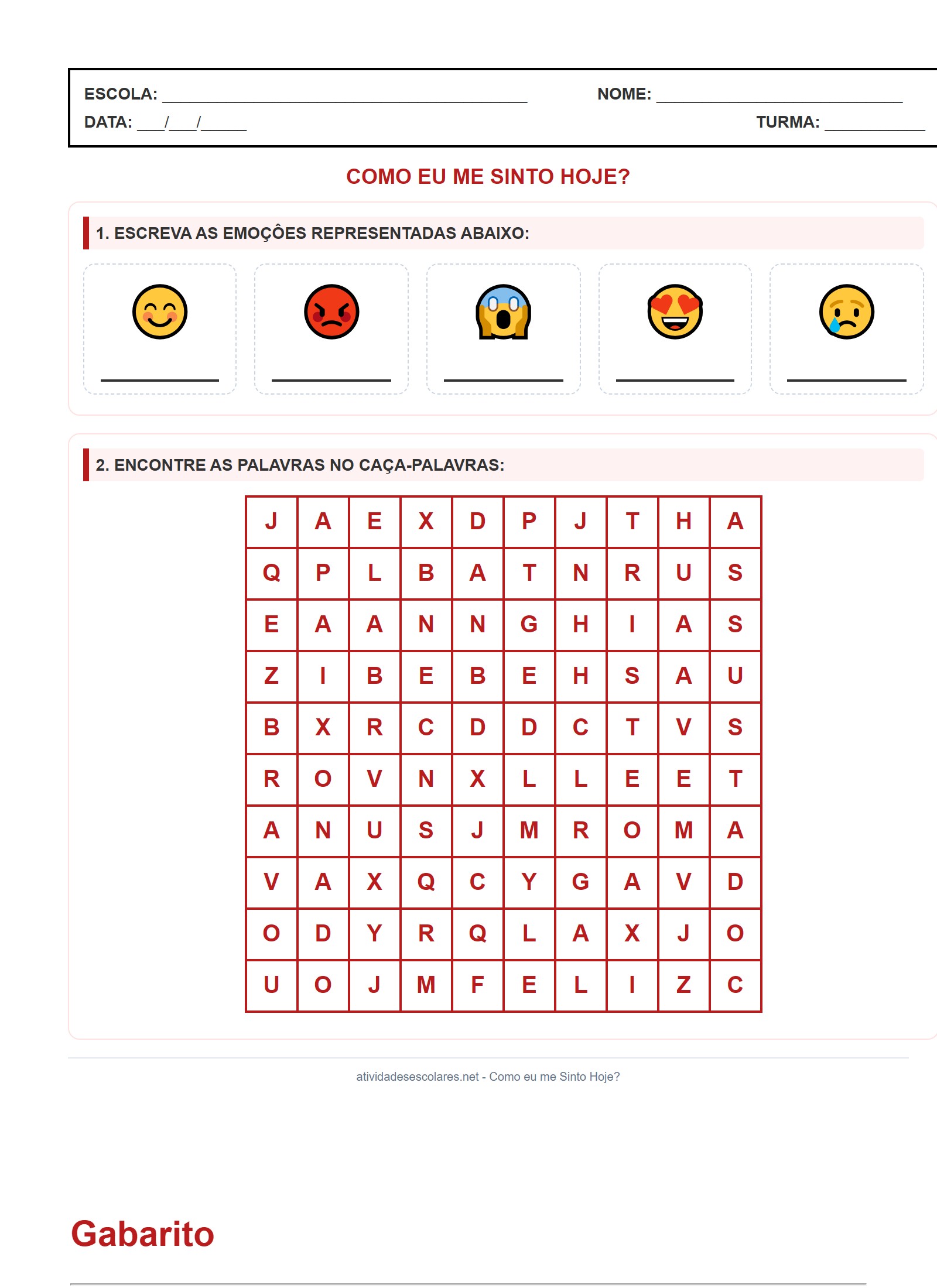1. ESCREVA AS EMOÇÔES REPRESENTADAS ABAIXO: