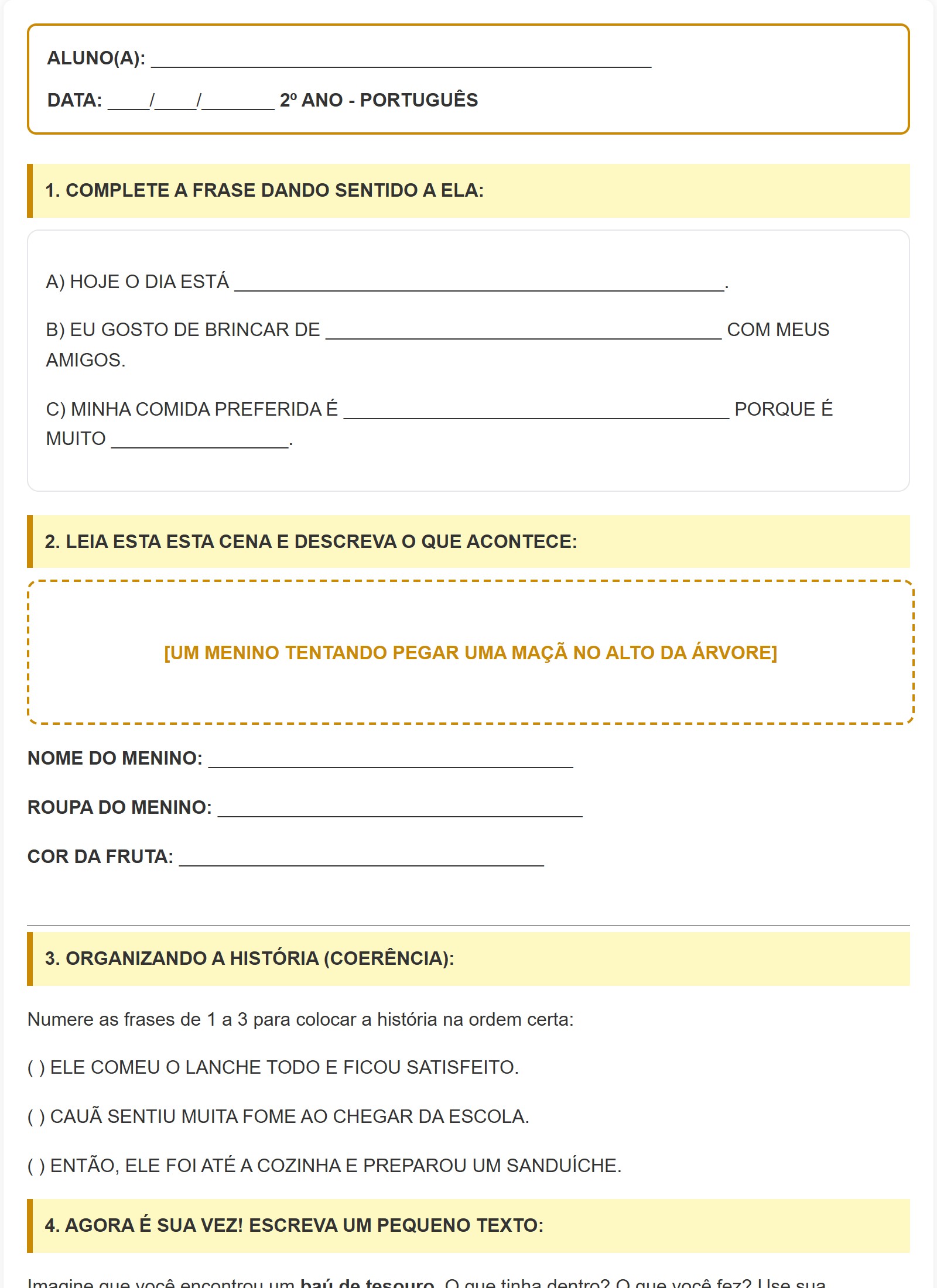 4. AGORA É SUA VEZ! ESCREVA UM PEQUENO TEXTO:Imagine que você encontrou um baú de tesouro. O que tinha dentro? O que você fez? Use sua imaginação!