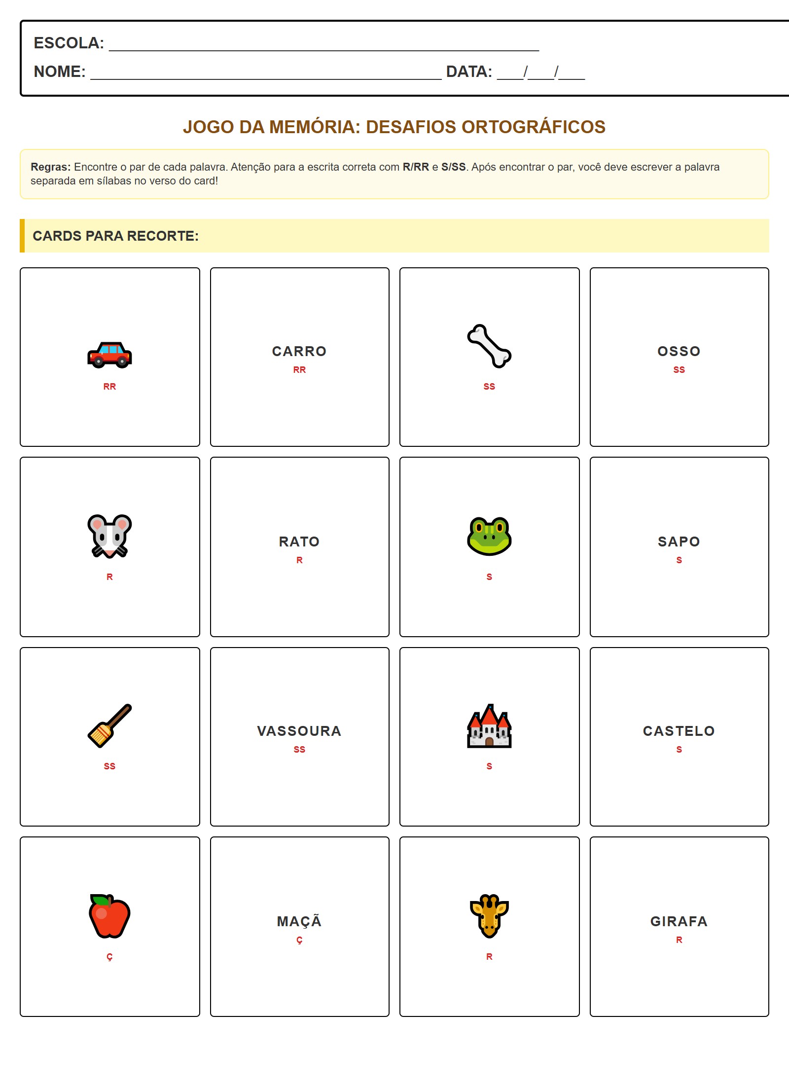 . Após encontrar o par, você deve escrever a palavra separada em sílabas no verso do card!