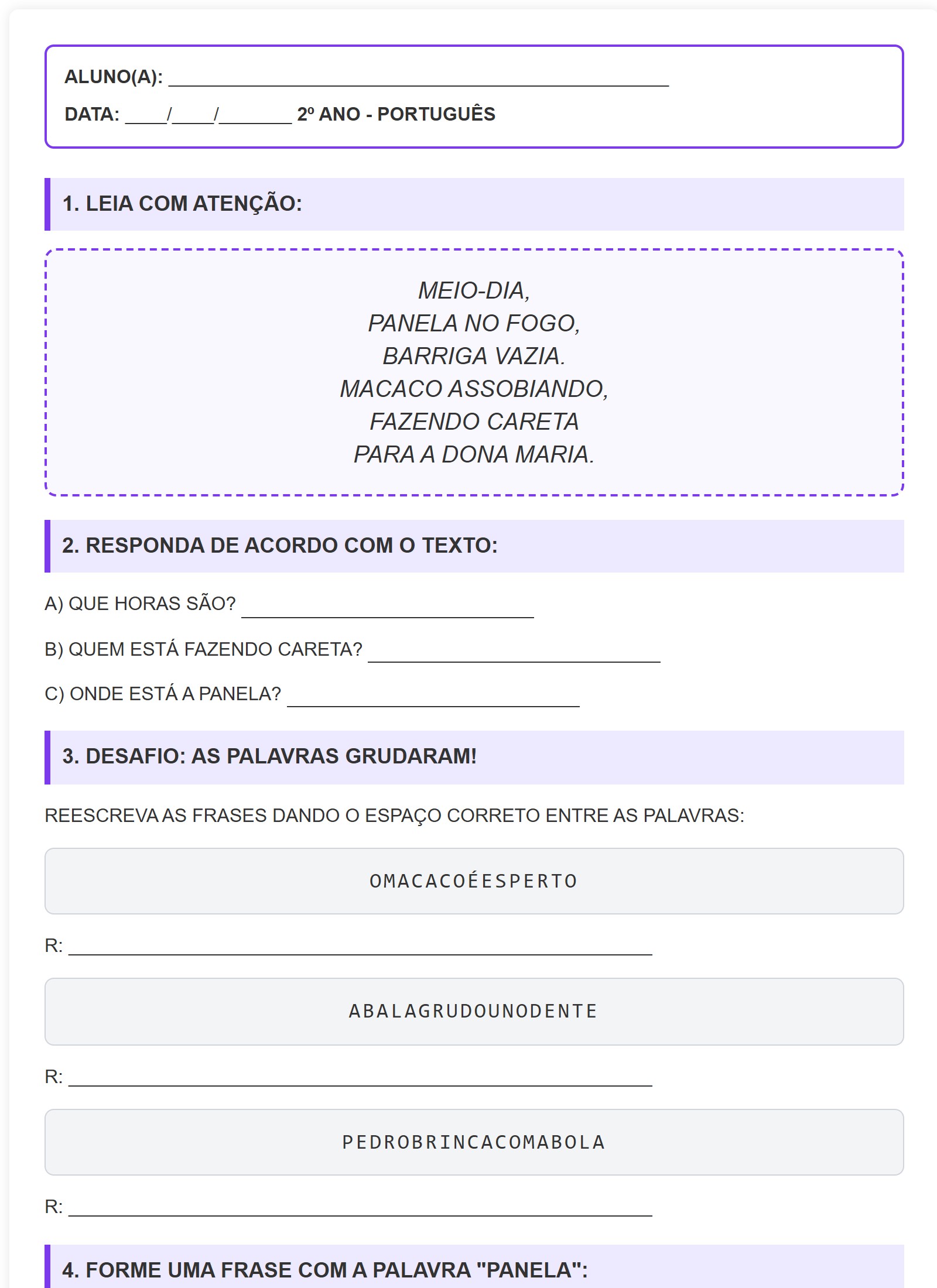 3. DESAFIO: AS PALAVRAS GRUDARAM!REESCREVA AS FRASES DANDO O ESPAÇO CORRETO ENTRE AS PALAVRAS: