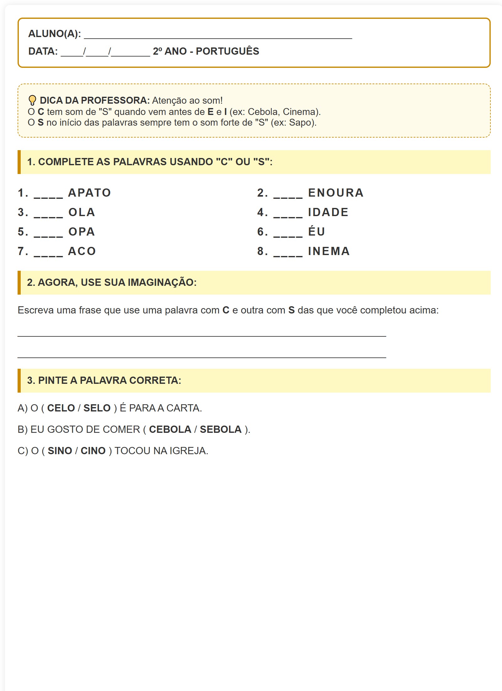 Escreva uma frase que use uma palavra com C e outra com S das que você completou acima: