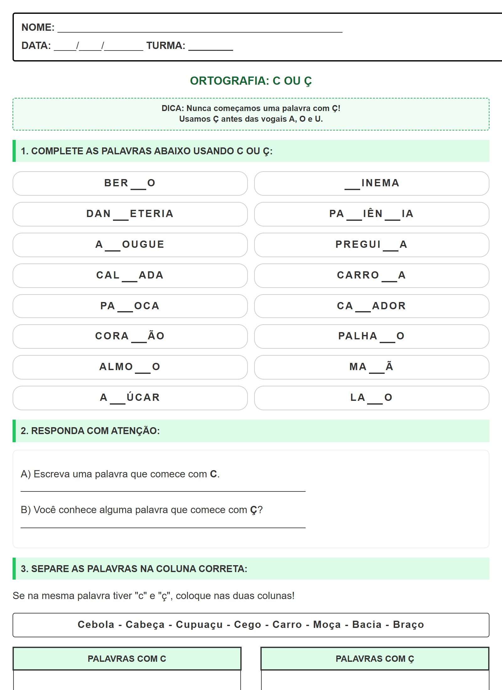 Se na mesma palavra tiver "c" e "ç", coloque nas duas colunas!