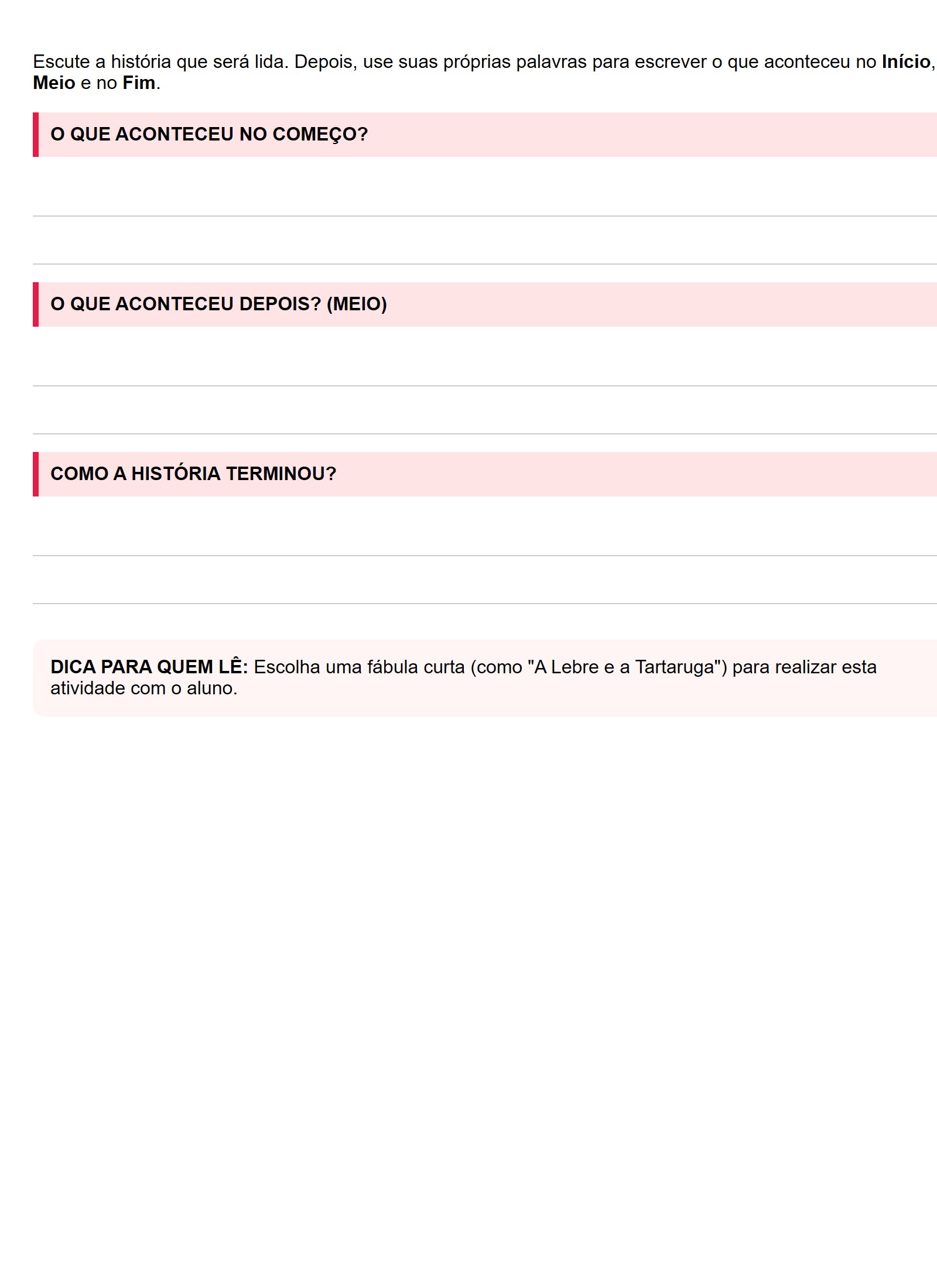 Escute a história que será lida. Depois, use suas próprias palavras para escrever o que aconteceu no Início, no Meio e no Fim.