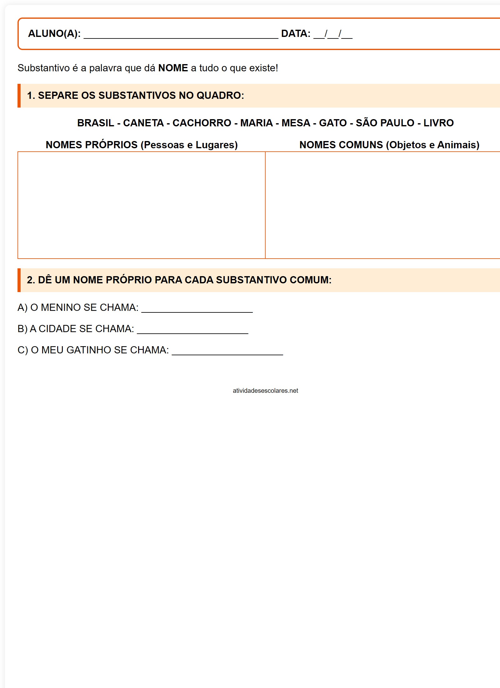 1. SEPARE OS SUBSTANTIVOS NO QUADRO:BRASIL - CANETA - CACHORRO - MARIA - MESA - GATO - SÃO PAULO - LIVRO