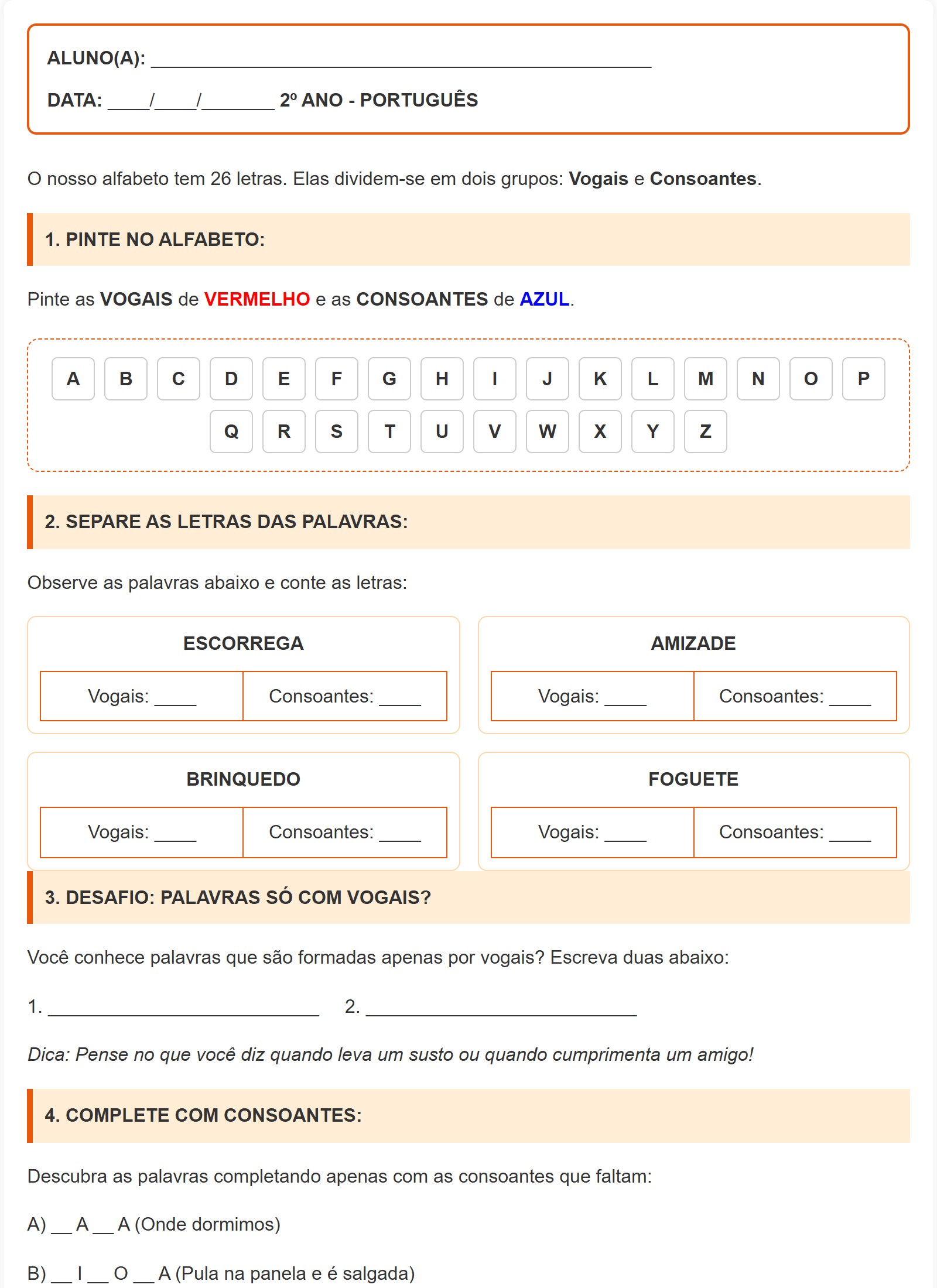 1. PINTE NO ALFABETO:Pinte as VOGAIS de VERMELHO e as CONSOANTES de AZUL.